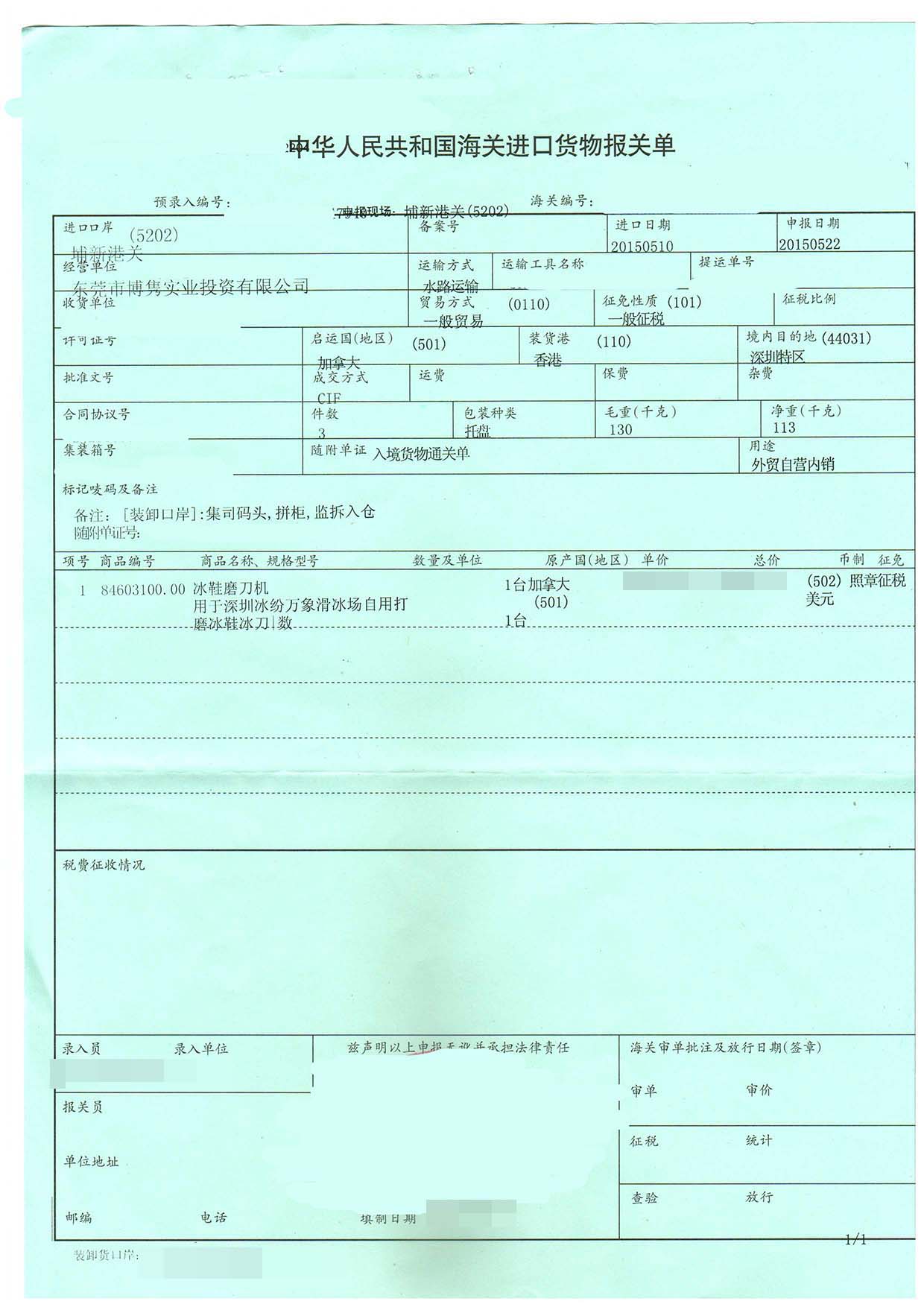 三、冰鞋磨刀機(jī)進(jìn)口報(bào)關(guān)案例展示