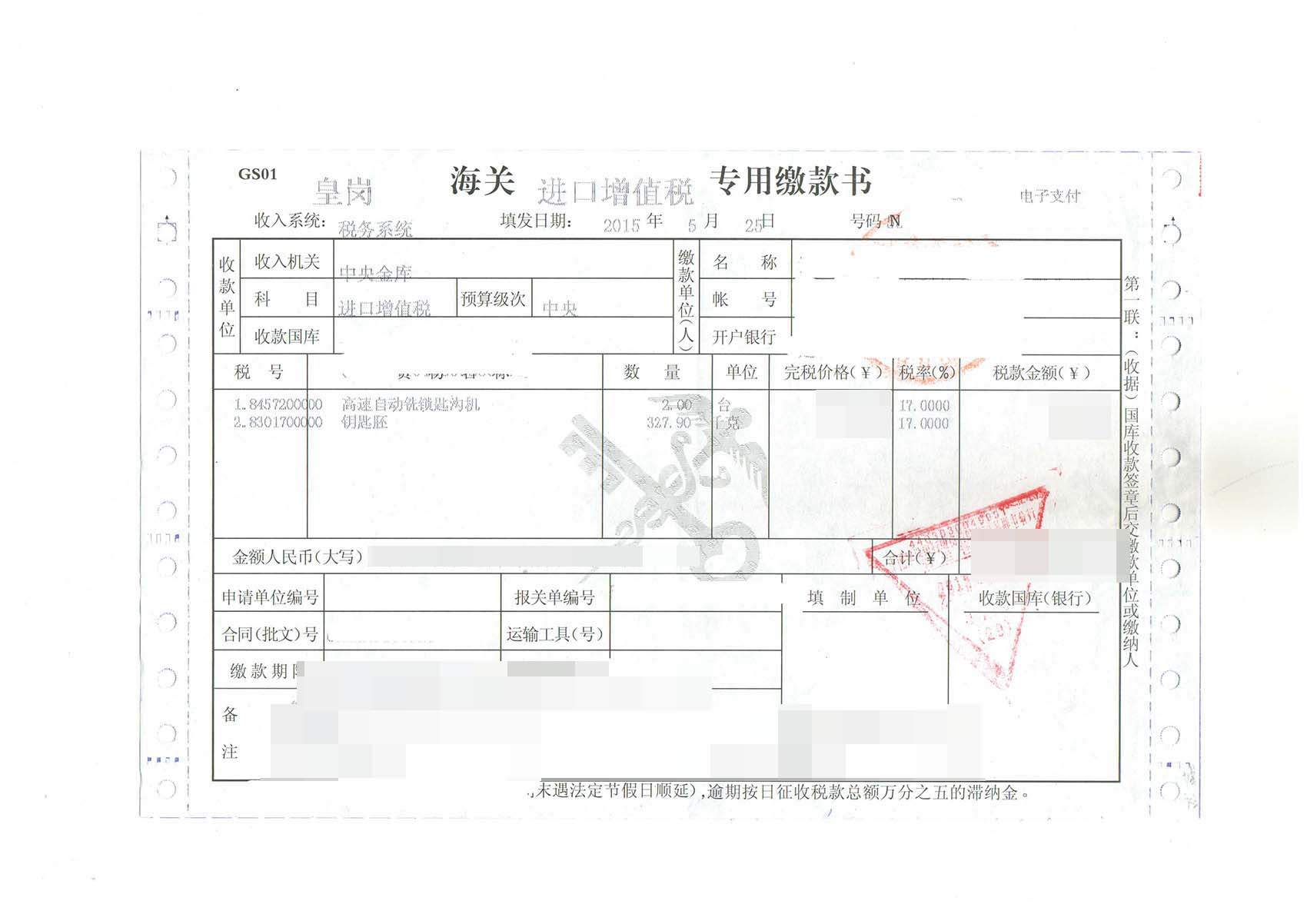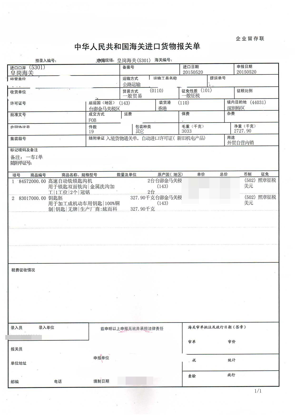 三、高速自動(dòng)銑鎖匙溝機(jī)進(jìn)口報(bào)關(guān)案例展示