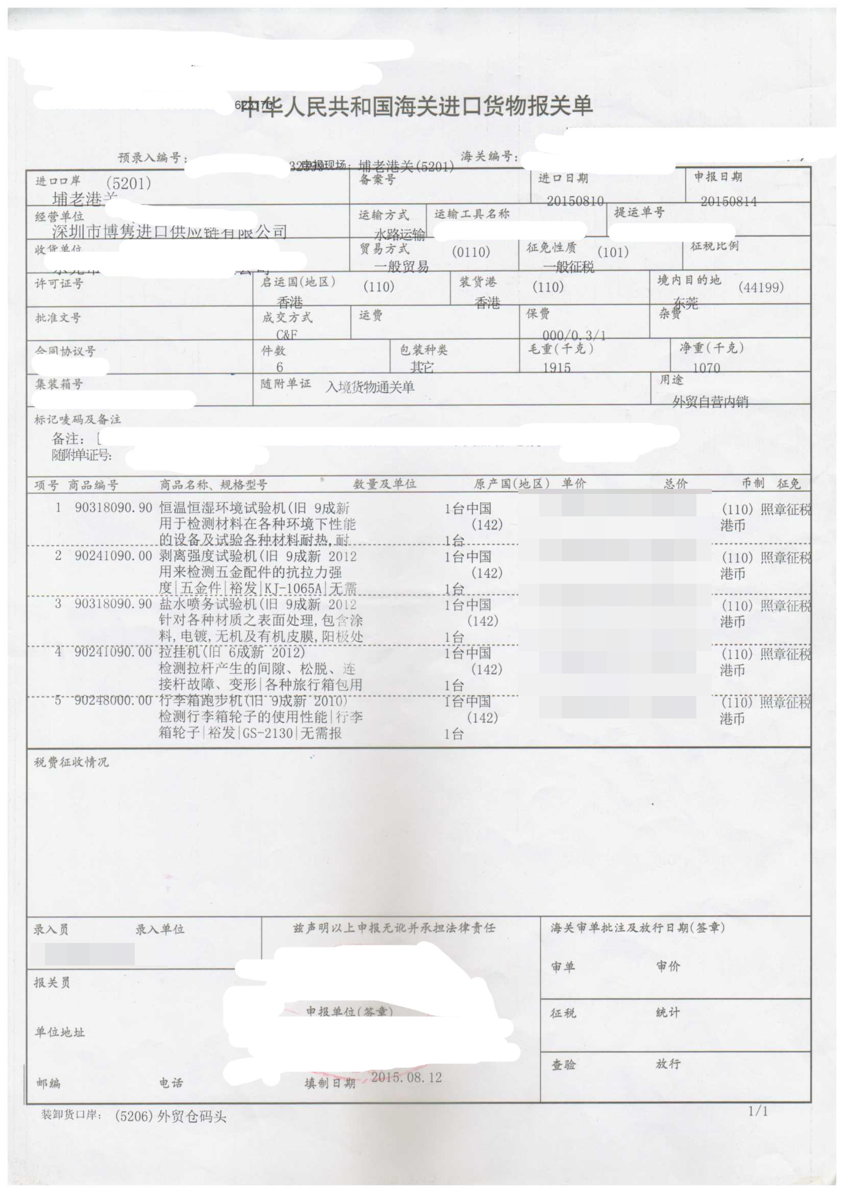一、舊試驗(yàn)機(jī)進(jìn)口報(bào)關(guān)手續(xù)資料