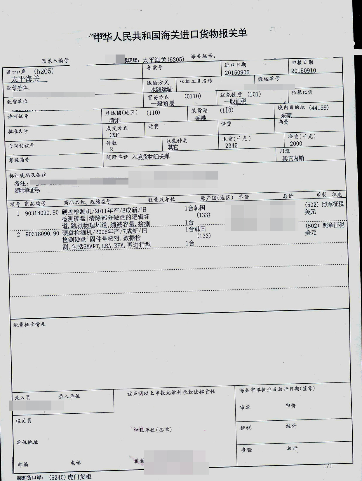 一、舊硬盤檢測機進口報關(guān)手續(xù)資料