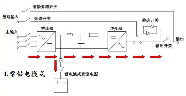 當(dāng)市電輸入正常時(shí),UPS 將市電穩(wěn)壓后供應(yīng)給負(fù)載使用,此時(shí)的UPS就是一臺(tái)交流式電穩(wěn)壓器,同時(shí)它還向機(jī)內(nèi)電池充電;當(dāng)市電中斷(事故停電)時(shí), UPS 立即將電池的直流電能,通過(guò)逆變器切換轉(zhuǎn)換的方法向負(fù)載繼續(xù)供應(yīng)220V交流電,使負(fù)載維持正常工作并保護(hù)負(fù)載軟、硬件不受損壞。從而達(dá)到不間斷供電的目的。