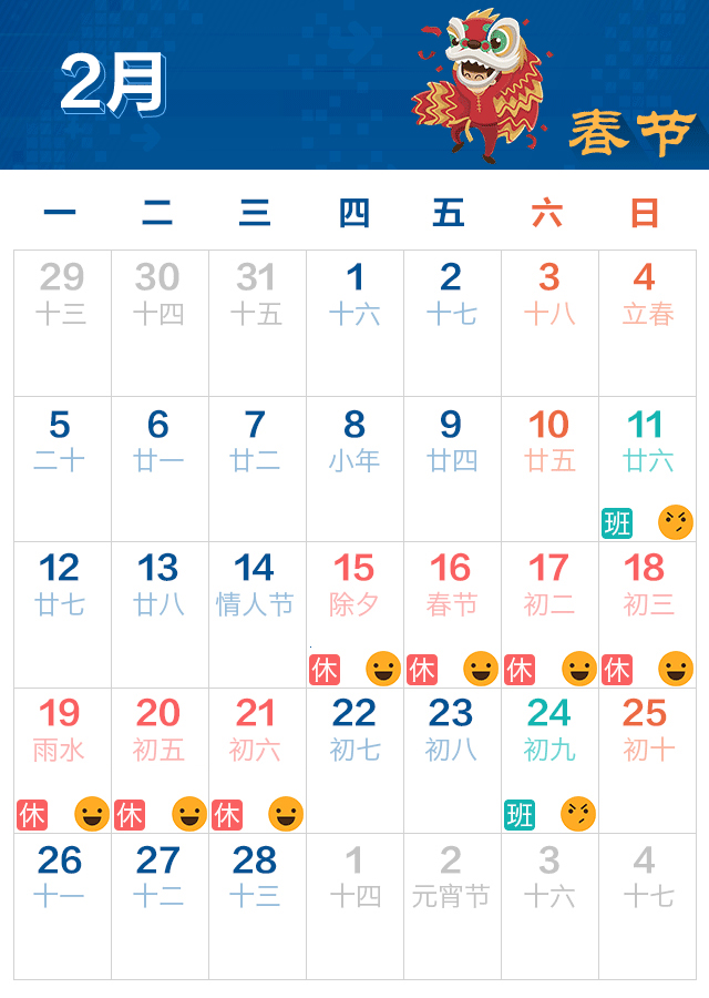 我司2018年春節(jié)假期由2月15日(除夕)至2月21日(年初六),共七天,2月22日星期四(年初七)正式上班,2.11日星期日、2月24日星期六補班一天。